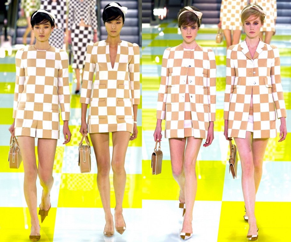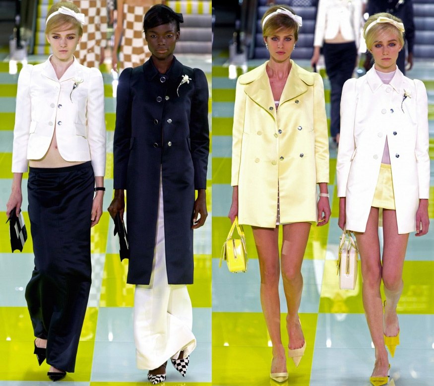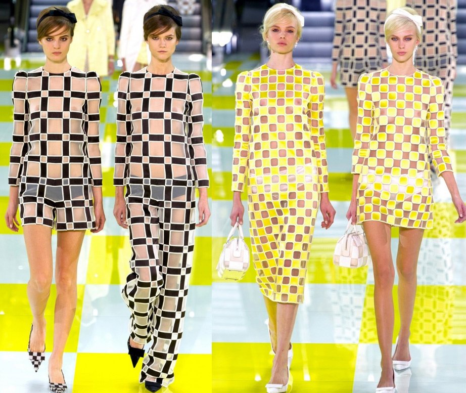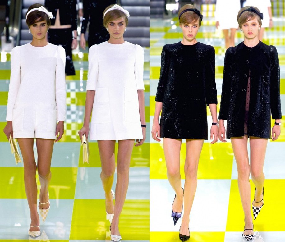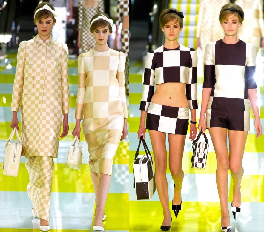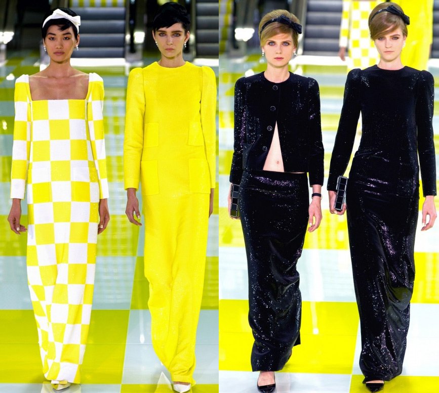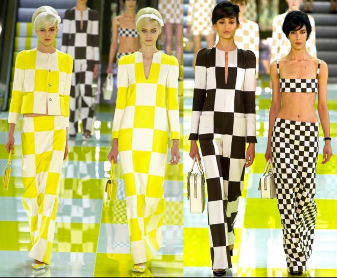 Le podium était décoré de manière inhabituelle - dans une cage jaune et blanche, à la surface de laquelle des modèles descendaient le long des escalators. Et la collection elle-même s'est avérée presque en damier - des costumes dans un petit et un grand carré, d'une combinaison de jaune et de blanc (il y avait beaucoup de jaune dans la collection) au noir et blanc classique.
