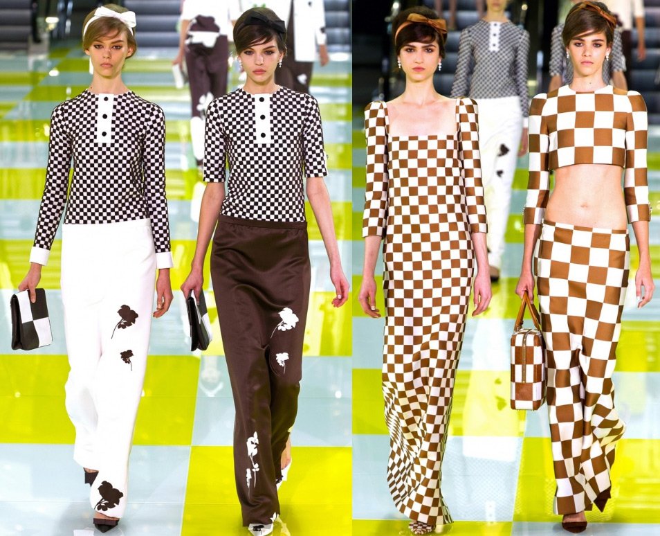 Cependant, pour que l'abondance de carrés ne se fasse pas complètement sentir dans les yeux, le créateur a également inclus dans sa collection des vêtements unis - robes et jupes noires, pantalons et hauts unis jaunes, un motif vert sur blanc et blanc sur vert.