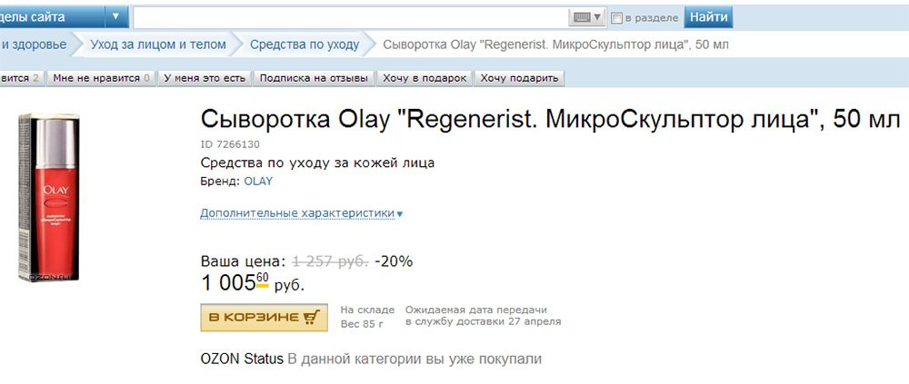 Je ne pourrai pas obtenir 40% sur l'achat de ce sérum, mais néanmoins, dans la boutique OZONE, vous pouvez trouver des offres avantageuses de cosmétiques, surtout si vous savez chercher, et surtout, pouvoir attendre diverses promotions et n'effectuez vos achats que lorsque l'avantage maximum brille.