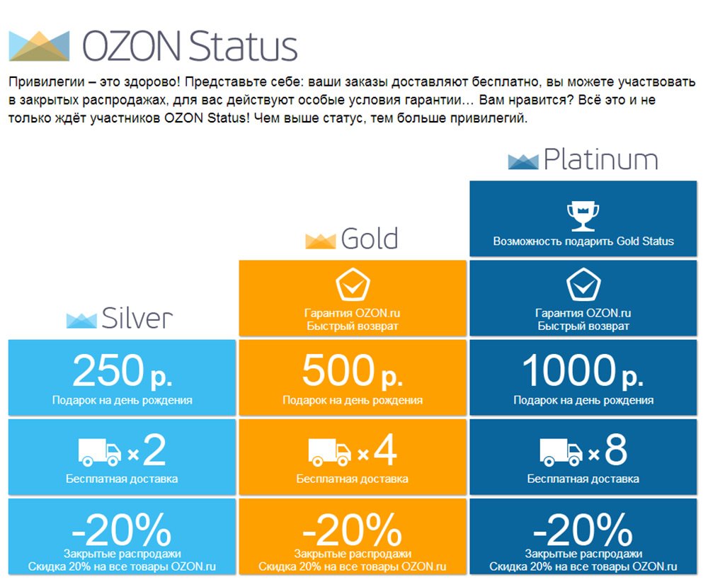 Ils ont récemment introduit une innovation - l'attribution de statuts. Selon le montant de vos achats pour l'année, un statut vous est attribué. J'ai obtenu le statut d'or, mais en substance, les statuts d'or, d'argent et de platine donnent le même rabais de 20%. Les statuts diffèrent par la taille du cadeau d'anniversaire et le nombre de livraisons gratuites.
